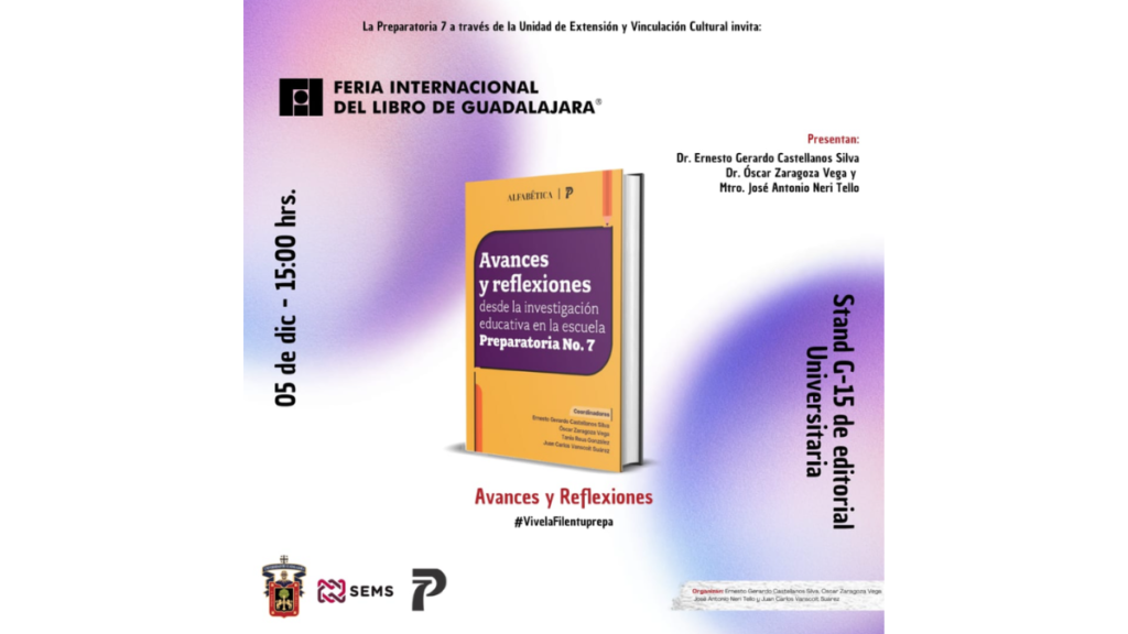 En el marco de las actividades por la FIL 2024, se presentará una obra denominada: «Avances y Reflexiones desde la investigación educativa en la Escuela Preparatoria No. 7», que tendrá verificativo en punto de las 15:00 horas del día 05 de diciembre del 2024 en el Stand G-15 de editorial Universitaria.