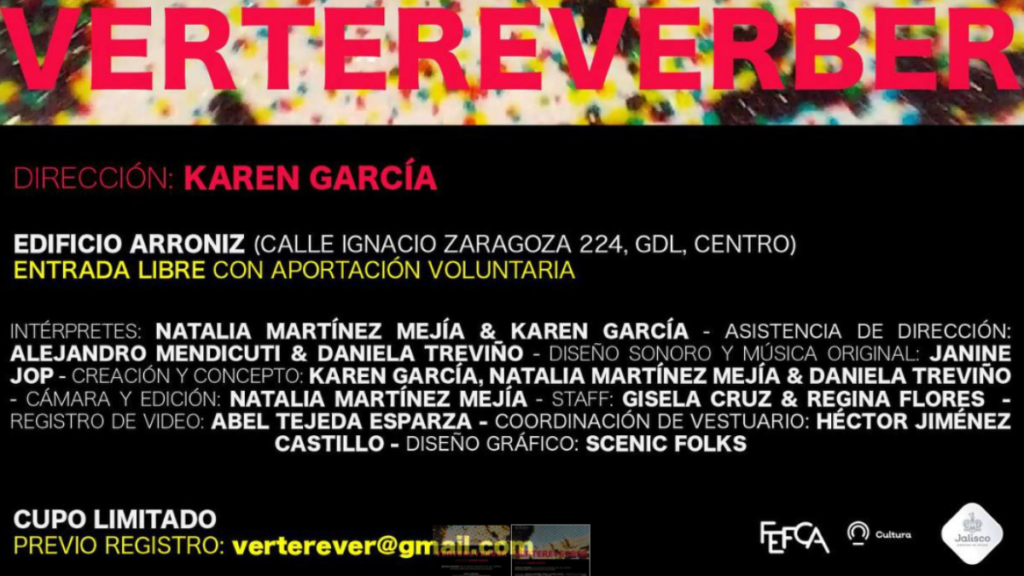 La obra «Vertereverber», presentada por la artista multidisciplinaria Karen García, se llevará a cabo el viernes 11 de octubre en el Edificio Arroniz en dos funciones, a las 19:30 y 20:30 horas. La entrada será libre con aportación voluntaria, pero con cupo limitado, por lo que se necesita registro previo a través del correo vertereverber@gmail.com.