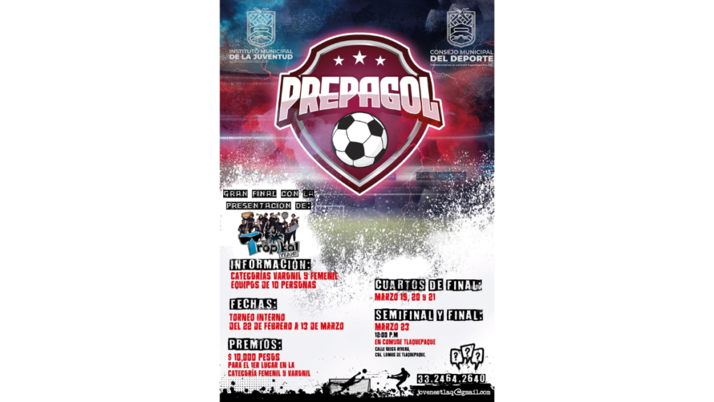 Con la finalidad de promover estilos de vida saludable y fomentar el deporte en las y los jóvenes del municipio, el Instituto Municipal de la Juventud de San Pedro Tlaquepaque (IMJUVET), arrancará el próximo sábado 22 de febrero el torneo deportivo “Prepagol”, el cual se llevará a cabo en diferentes escuelas preparatorias del municipio.