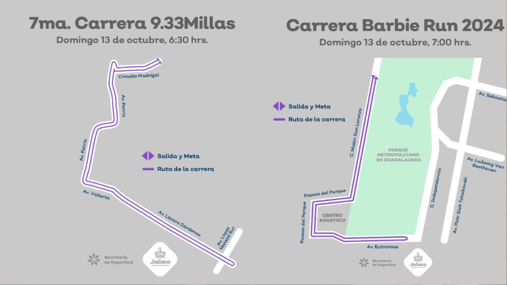 Además, se celebrará la Barbie Run 2024 el mismo día. Esta competencia incluye una caminata de 3 kilómetros y carreras de 5 y 10 kilómetros en el área del Polideportivo Metropolitano. La salida y meta estarán frente al Parque Metropolitano de Guadalajara, sobre la avenida Ecónomos, y las actividades comenzarán también a las 06:30 horas. Los participantes recorrerán calles como Misión San Lorenzo, Independencia, Sebastián Bach y Piotr Ilich Tchaikovski.
