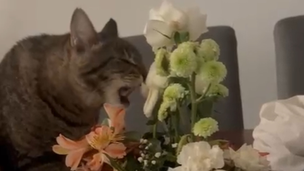¡Gato se vuelve viral por comerse un arreglo floral!