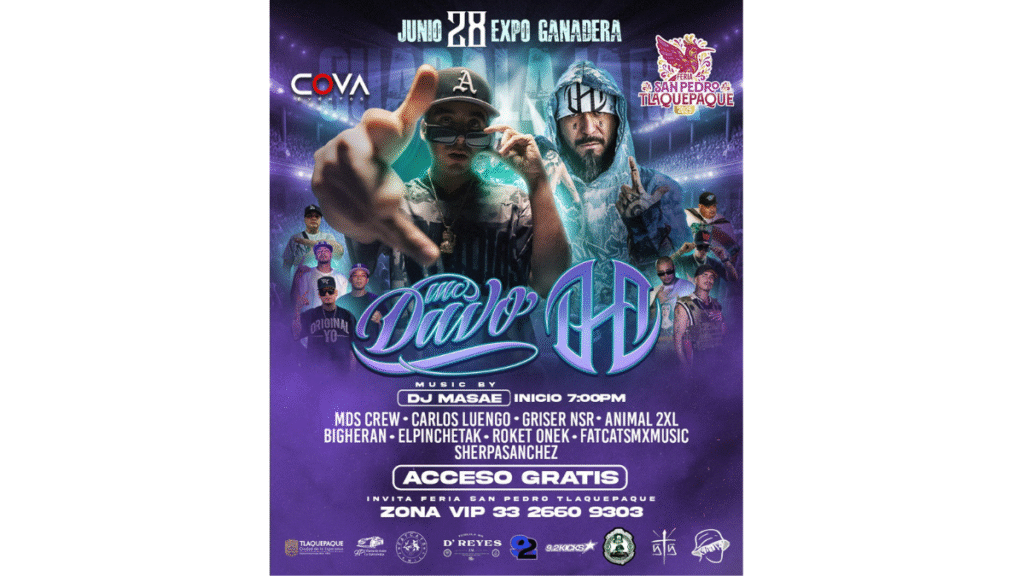 Dentro de las actividades de la Feria de San Pedro Tlaquepaque, por primera vez en la historia de estas festividades, se abre espacio a nuevos géneros musicales con la presentación de dos grandes exponentes del rap en español MC Davo y Dharius, quienes compartirán escenario en la expo Ganadera este próximo viernes 28 de junio a las 19:00 horas.