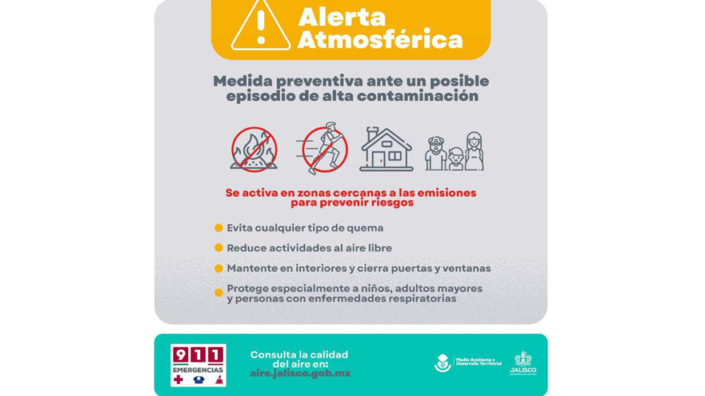 Se puede consultar la calidad del aire en tiempo real, así como el seguimiento al estatus de este y otros episodios de mala calidad del aire en la cuenta de X (@AireySaludAMG). La información relacionada a la calidad del aire se puede obtener a través del sitio web https://aire.jalisco.gob.mx/ .