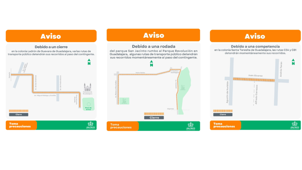 Se invita a la ciudadanía a mantenerse informada a través de las redes sociales de la Secretaría de Transporte, en Facebook como @SecretariadeTrasnporteJal y en X como @TransporteJal, para conocer más sobre información de estos y otros desvíos.