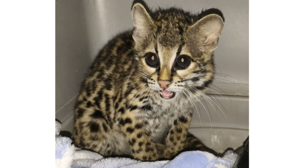 Especialistas de la Unidad de Rescate de Fauna Silvestre de Tlajomulco (URFST) atienden a un ejemplar de tigrillo, se trata de un macho de entre cuatro y seis meses de edad, con un peso de 1.3 kilogramos, proveniente del municipio de Manzanillo, Colima, el cual fue entregado para su atención, por parte académicos de la Universidad de la Costa Sur.