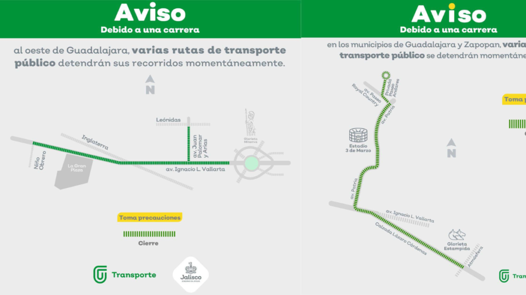 Con motivo de tres carreras deportivas que se llevarán a cabo el domingo 10 de noviembre en vialidades de los municipios de Guadalajara y Zapopan, algunas rutas del transporte público modificarán sus recorridos mientras que otras se detendrán, momentáneamente, al paso del contingente de participantes.