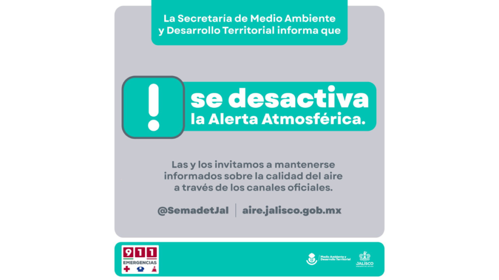 La Secretaría de Medio Ambiente y Desarrollo Territorial (Semadet) desactivó, a las 18:00 horas, las Alertas Atmosféricas que se mantenían en los municipios de Tala, Tlajomulco e Ixtlahuacán de los Membrillos.