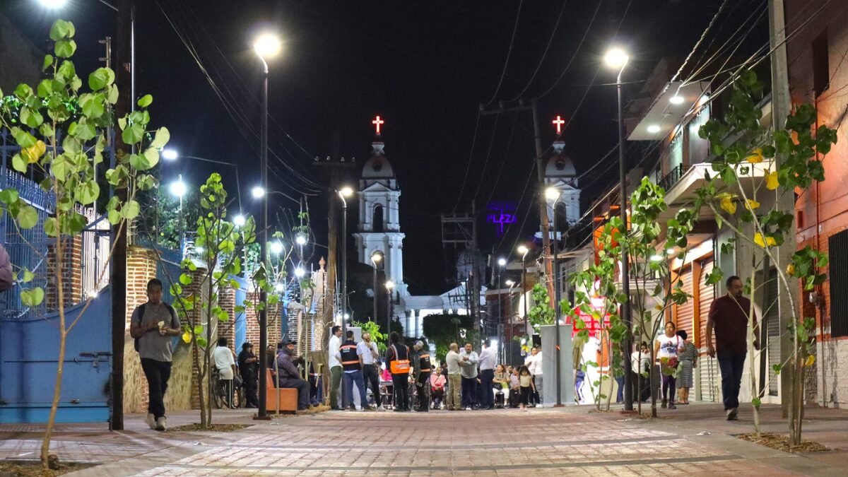 “Es importante primero arreglar las venas de la vialidad. Posteriormente, logramos consolidar este concreto estampado, unificando las banquetas para generar una zona tranquilizada. Con esto llevamos casi 400 metros lineales de intervención entre Flaviano e Hidalgo, y vamos a alcanzar los 500 metros con la calle Juárez para lograr toda la integración; esto se suma a lo que hicimos en el mercado. Instalamos iluminación LED para generar un mejor ahorro en el consumo. Algo importante también es que dejamos la preparación de toda la ductería para migrar el cableado aéreo que tenemos actualmente, bajar las cableras e instalaciones eléctricas y poder limpiar el espacio aéreo”, detalló el funcionario.