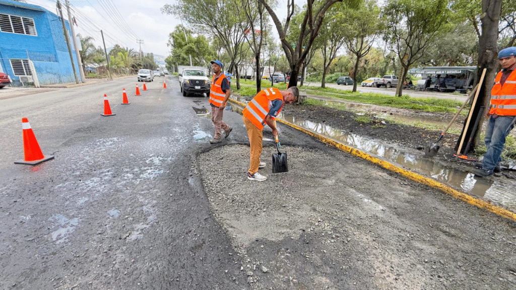 Las cuadrillas municipales realizan labores de bacheo emergente. Es importante señalar que estas acciones son temporales y no representan una solución definitiva, pues en la zona se desarrolla un proyecto integral en coordinación con el Gobierno del Estado, el cual permitirá atender de raíz la problemática.