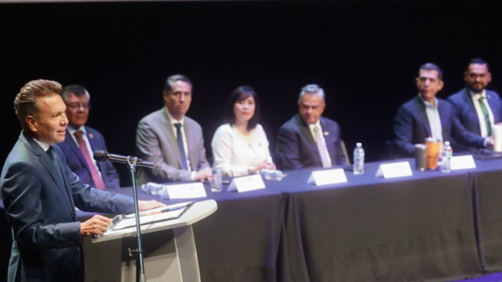 Lemus Navarro explicó a los presentes el novedoso Plan Carretero Estatal  2025 – 2030, que ejercerá 24 mil millones de pesos para la intervención integral de la Red Estatal de Carreteras, la cual estará terminada el próximo año.