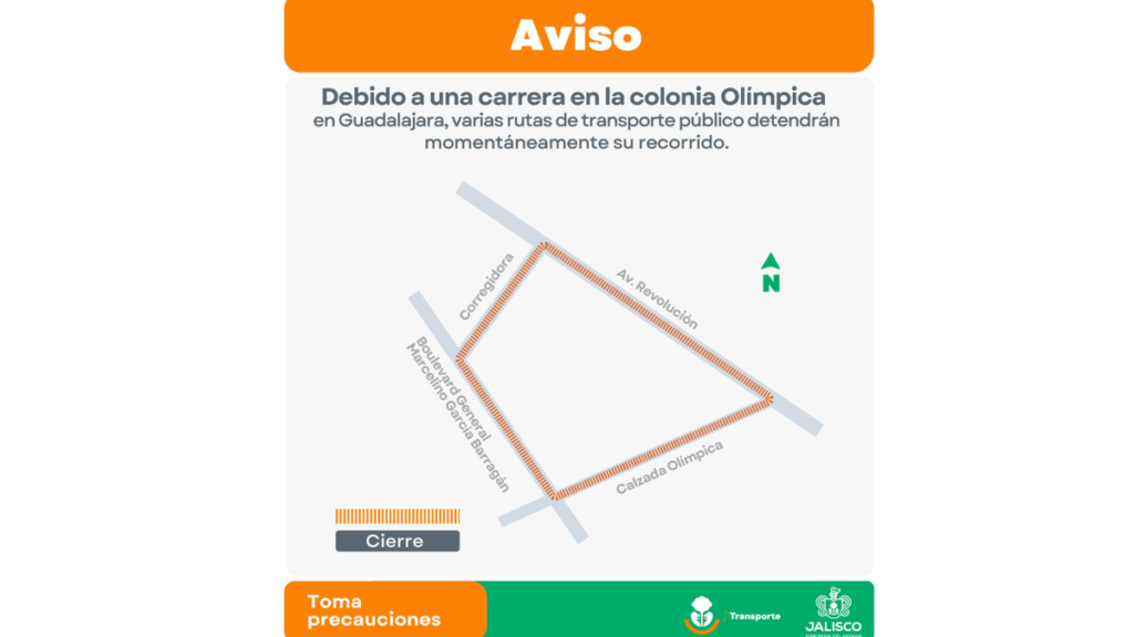 El Gobierno de Jalisco, a través de la Secretaría de Transporte (Setran), informa que debido a una carrera deportiva en Guadalajara algunas rutas del transporte público modificarán, este sábado, su trayecto o detendrán su servicio de manera temporal.