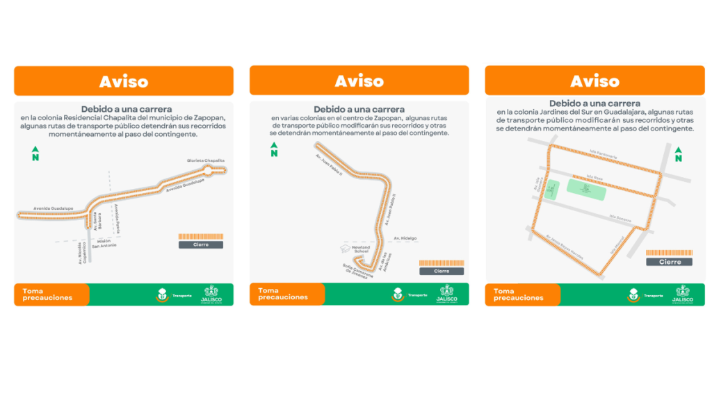 Se invita a la ciudadanía a mantenerse informada a través de las redes sociales de la Secretaría de Transporte, en Facebook como @SecretariadeTrasnporteJal y en X como @TransporteJal, para conocer más sobre información de estos y otros desvíos.