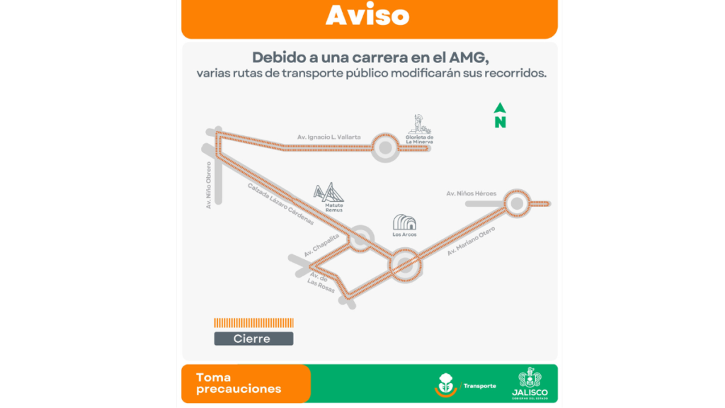El Gobierno de Jalisco, a través de la Secretaría de Transporte (Setran), informa que por la realización del Medio Maratón de Guadalajara 2025, varias rutas del transporte público modificarán sus recorridos de manera temporal y otras se detendrán momentáneamente al paso del contingente de participantes.