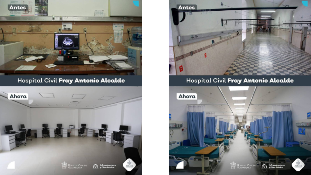 Asimismo, recientemente, el Gobernador Enrique Alfaro también entregó las obras de transformación del bicentenario Hospital Civil de Guadalajara “Fray Antonio Alcalde” con una inversión de 930 millones de pesos (mdp), que pasó de ser un espacio sombrío pasó a ser un sitio a la altura de cualquier hospital particular, en el cual se renovaron desde ductos sanitarios, de energía eléctrica y gases medicinales hasta pisos, techos, muros, mobiliario y equipamiento de las salas de hospitalización adultos en la parte antigua, jardines, patios, ingreso principal, nuevos quirófanos de Urología y la creación de la tan esperada Unidad de atención integral a Niñas, Niños y Adolescentes con Quemaduras.