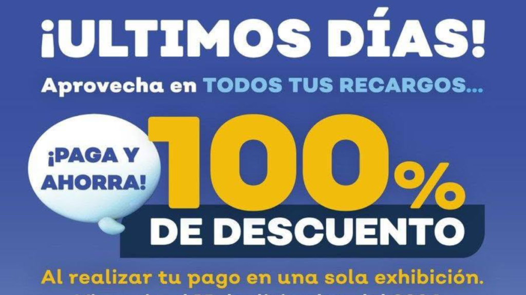 Si se realiza el pago en una sola exhibición, se aplica al usuario un 100% por ciento de descuento sobre el total de los recargos del adeudo.