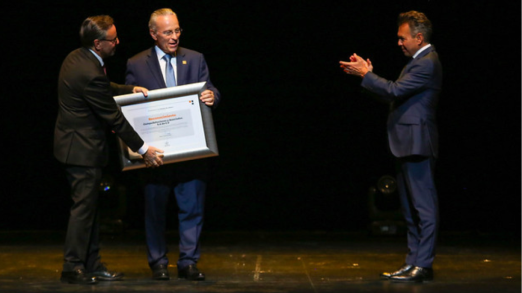 La ceremonia tuvo lugar en la Sala Plácido Domingo del Conjunto Santander de Artes Escénicas, en la que el mandatario estatal entregó un reconocimiento a esta empresa jalisciense.