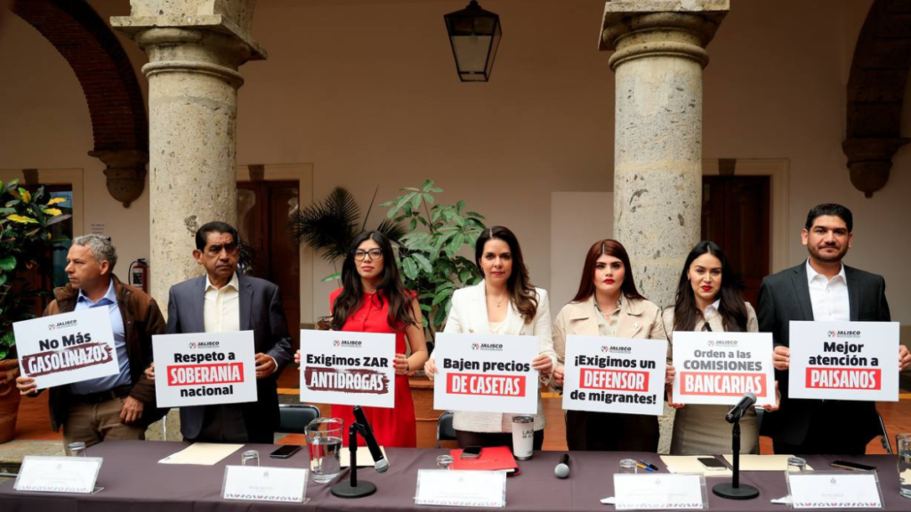 Que bajen los precios de las gasolinas que se disminuya el cobro excesivo en las comisiones bancarias, que se revoque el alza de las tarifas de las casetas de cobro, y que se detenga de manera inmediata la elección judicial, fueron algunas de las exigencias presentadas el día de hoy en el Congreso de Jalisco por el Grupo Parlamentario del PRI, su Dirigencia Estatal, representantes de las presidencias municipales y cabildos del Estado.