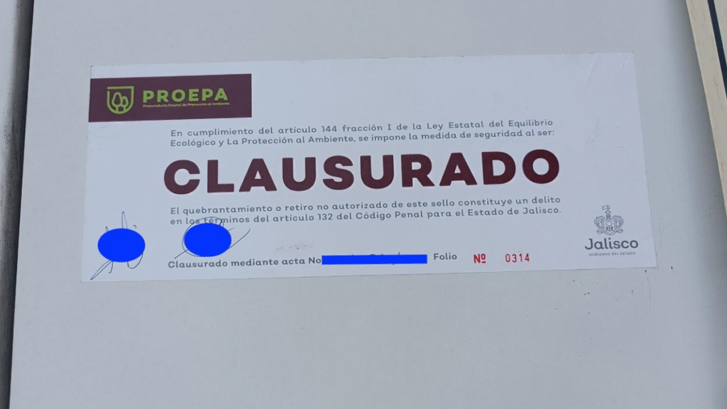 Tras detectar diversas irregularidades en materia ambiental la Procuraduría Estatal de Protección al Ambiente de Jalisco (PROEPA), realizó el 21 de mayo tres clausuras —una total temporal y dos parciales temporales— en los municipios de Teocuitatlán de Corona, El Salto y Zapopan.