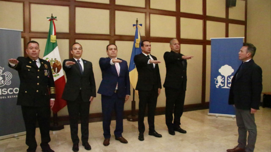 Los mandos que juraron cumplir con su deber son Roberto Alarcón Estrada, Coordinador General Estratégico de Seguridad; Juan Pablo Hernández González, Secretario de Seguridad; Jorge Alberto Arizpe, Comisario de la Policía Vial; Juan Carlos Contreras, Director de Escudo Urbano C5 y Sergio Ramírez López, Director de la Unidad Estatal de Protección Civil y Bomberos de Jalisco.