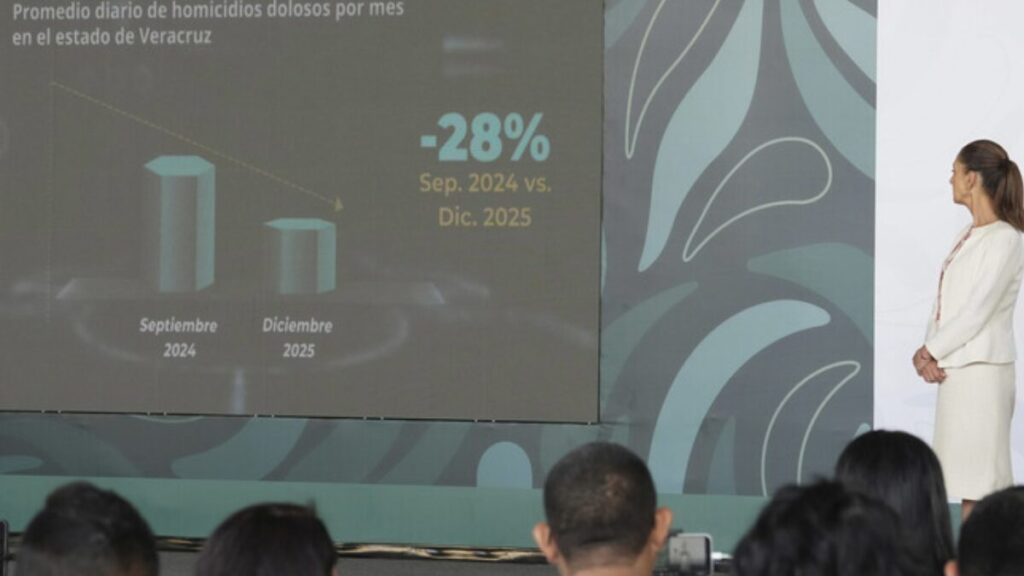 La Presidenta Claudia Sheinbaum Pardo destacó que, en Veracruz, con la Estrategia Nacional de Seguridad y gracias a la coordinación que hay con la entidad, se redujo en 28 por ciento el homicidio doloso, entre septiembre de 2024 y diciembre de 2025, al pasar de 3.13 a 2.48 el promedio diario de víctimas de ese delito.