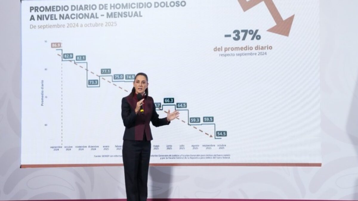 La Presidenta de México, Claudia Sheinbaum Pardo, resaltó la disminución de 37 por ciento en el promedio diario de homicidios dolosos, de septiembre de 2024 a octubre de 2025, al pasar de un promedio de 86.9 víctimas diarias a 54.5, respectivamente, es decir, hubo 32 homicidios dolosos menos diarios.