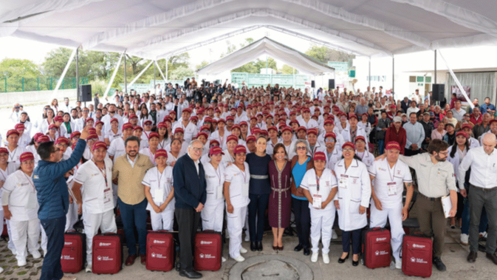 Acompañaron a la Presidenta de México, el secretario técnico de la Presidencia de la República y director general de Programas para el Bienestar, Carlos Torres Rosas; la subsecretaria de Egresos, Bertha Gómez Castro; y la facilitadora de la salud, Esthela Guzmán Cruz, quien realizó una breve explicación de los insumos médicos que contiene el maletín que se otorgó a las enfermeras, enfermeros, médicas y médicos del programa.