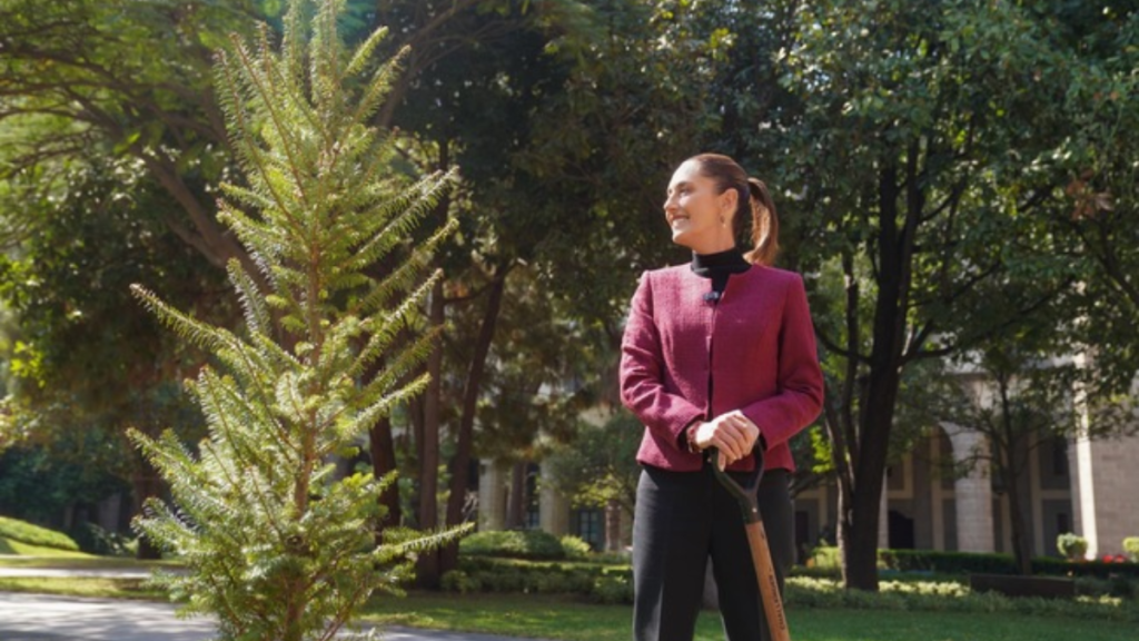La Jefa del Ejecutivo Federal cerró el 2024 sembrando en el Jardín Nezahualcóyotl de Palacio Nacional un árbol Abiesreligiosa, una conífera nativa de los bosques del centro y sur del país.