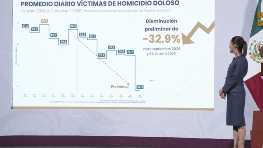 La Presidenta Claudia Sheinbaum Pardo resaltó que, gracias a la implementación de los cuatro ejes de la Estrategia Nacional de Seguridad, ha disminuido en 32.9 por ciento el promedio diario de víctimas de homicidio doloso entre septiembre de 2024 y el 21 de abril de 2025, de acuerdo con datos preliminares.