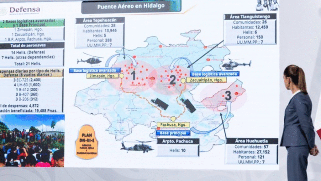 El Gobierno de México informa que, la Secretaría de la Defensa Nacional, activó en Hidalgo tres Centros de Mando con 111 puentes aéreos con 21 helicópteros: 14 aeronaves de la Defensa y siete de otras dependencias, estableciendo una Base Principal en el aeropuerto de Pachuca y dos Bases Logísticas Avanzadas en Zimapán y Zacualtipán, las cuales tienen la capacidad de trasladar al día 4 mil 872 despensas en beneficio de 19 mil 488 personas afectadas por las lluvias.