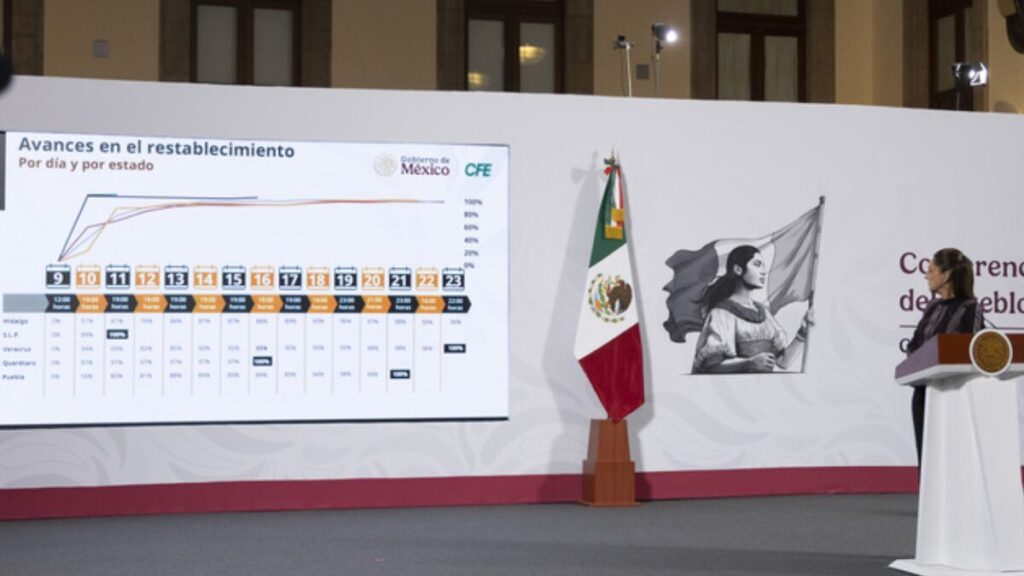 La directora general de la Comisión Federal de Electricidad (CFE), Emilia Calleja Alor, detalló que se tiene un avance de 99.82 por ciento en el restablecimiento del suministro eléctrico. En San Luis Potosí se alcanzó el 100 por ciento desde el 11 de octubre, en Querétaro desde 16 de octubre, en Puebla desde el 21 de octubre, en Veracruz el 23 de octubre, mientras que en el caso de Hidalgo se tiene un 99 por ciento, quedando 466 usuarios afectados por atender.