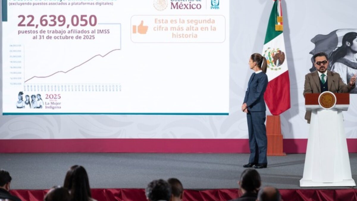 El Gobierno de México, a través del Instituto Mexicano del Seguro Social (IMSS), informó, en la conferencia matutina encabezada por la Presidenta Claudia Sheinbaum Pardo, que al 31 de octubre de 2025, se registraron 22 millones 639 mil 50 puestos, la segunda cifra más alta en la historia desde 1997, año en el que inició esta medición; la primera se registró en noviembre de 2024.