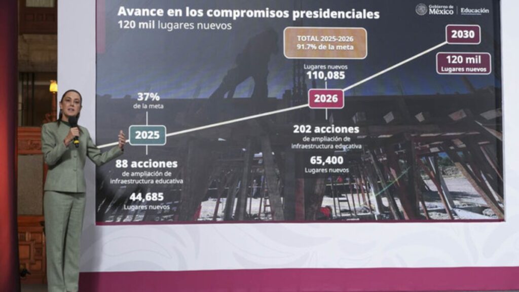 “¿Qué vamos a hacer en el 2026? 65 mil 400 nuevos lugares, es decir, 44 mil 685 más 65 mil 400 con 202 acciones de ampliación; ¿cómo? nuevos planteles, ampliación de planteles existentes y con esto que se llaman los telebachilleratos que le estamos dando una renovación de manera muy importante todos van a estar conectados a internet y están teniendo nuevos esquemas de formación y de enseñanza. De esta manera vamos a cumplir con que haya una preparatoria que quede cerca de la casa”, destacó en la conferencia matutina: “Las mañaneras del pueblo”.