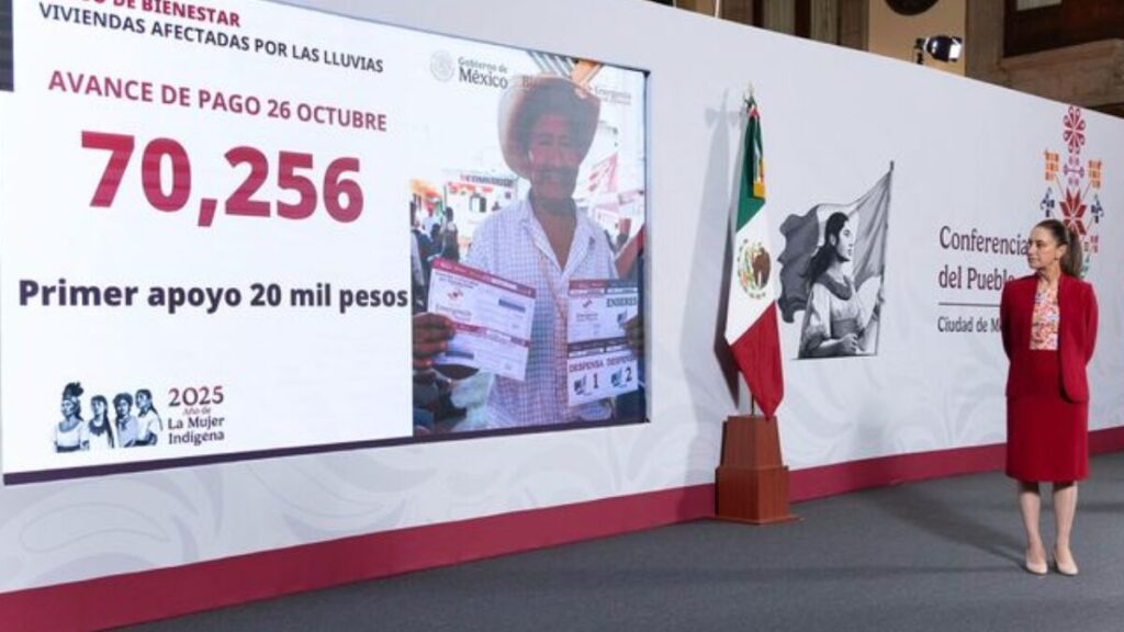 El Gobierno de México, a través de la Secretaría de Bienestar, informó que, al 26 de octubre, 70 mil 256 personas han recibido el primer apoyo de 20 mil pesos, así como dos vales de despensa y uno de enseres, por las afectaciones a causa de las lluvias extraordinarias registradas a comienzos de octubre en Veracruz, Hidalgo, Puebla, San Luis Potosí y Querétaro.