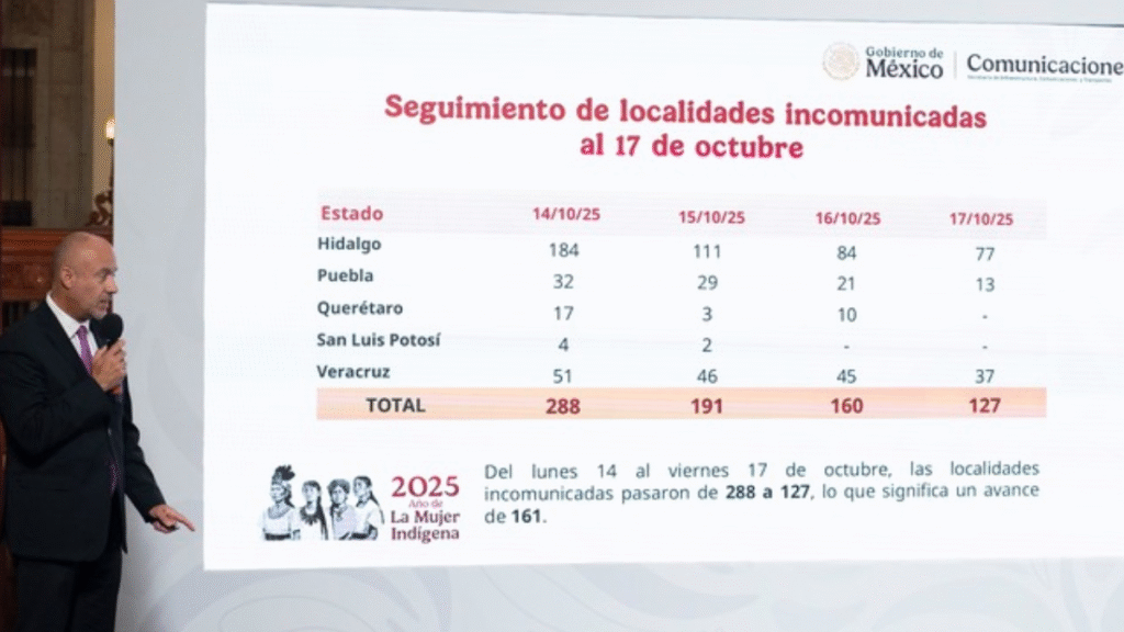 El Gobierno de México, a través de la Secretaría de Infraestructura, Comunicaciones y Transportes (SICT), informó que, del lunes 14 al viernes 17 de octubre, pasaron de 288 a 127 las localidades incomunicadas por las lluvias registradas en Hidalgo, Puebla, San Luis Potosí, Querétaro y Veracruz, lo que significa un avance de 161; resaltando que, en Querétaro y San Luis Potosí, ya no hay localidades incomunicadas.
