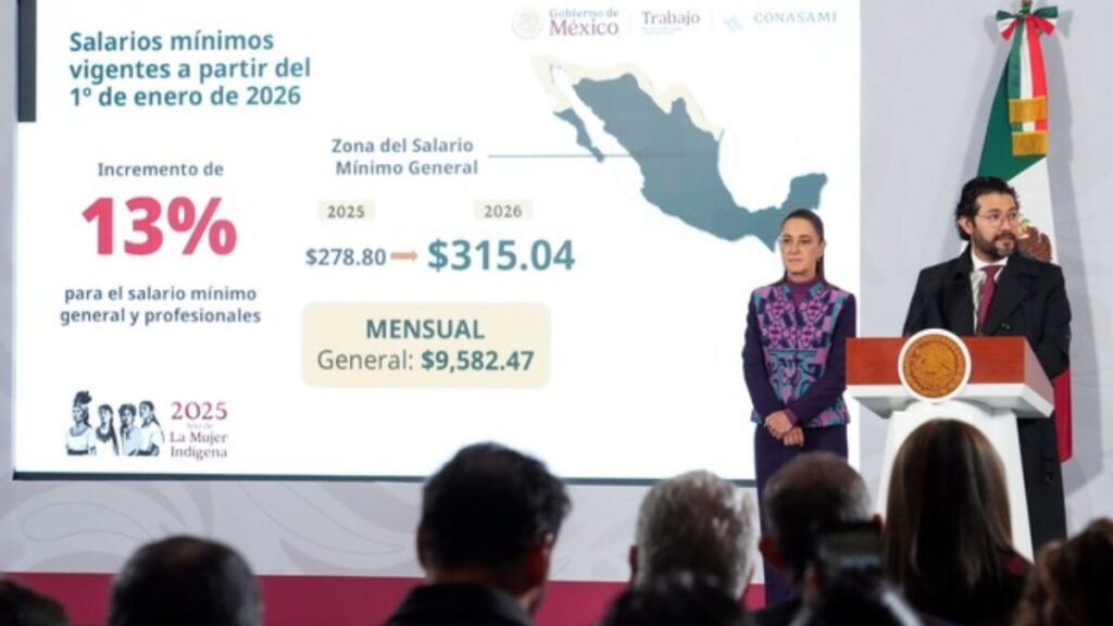 La Presidenta de México, Claudia Sheinbaum Pardo, anunció que, en acuerdo con el sector obrero y patronal, y en beneficio de 8.5 millones de personas trabajadoras, el salario mínimo general tendrá un incremento del 13 por ciento a partir del 1 de enero de 2026: de 315.04 pesos diarios a nivel general, lo que representa 9 mil 582.47 pesos mensuales y de 5 por ciento en la Zona Libre de la Frontera Norte (ZLFN) para quedar en 440.87 pesos diarios y en 13 mil 409.80 pesos mensuales.