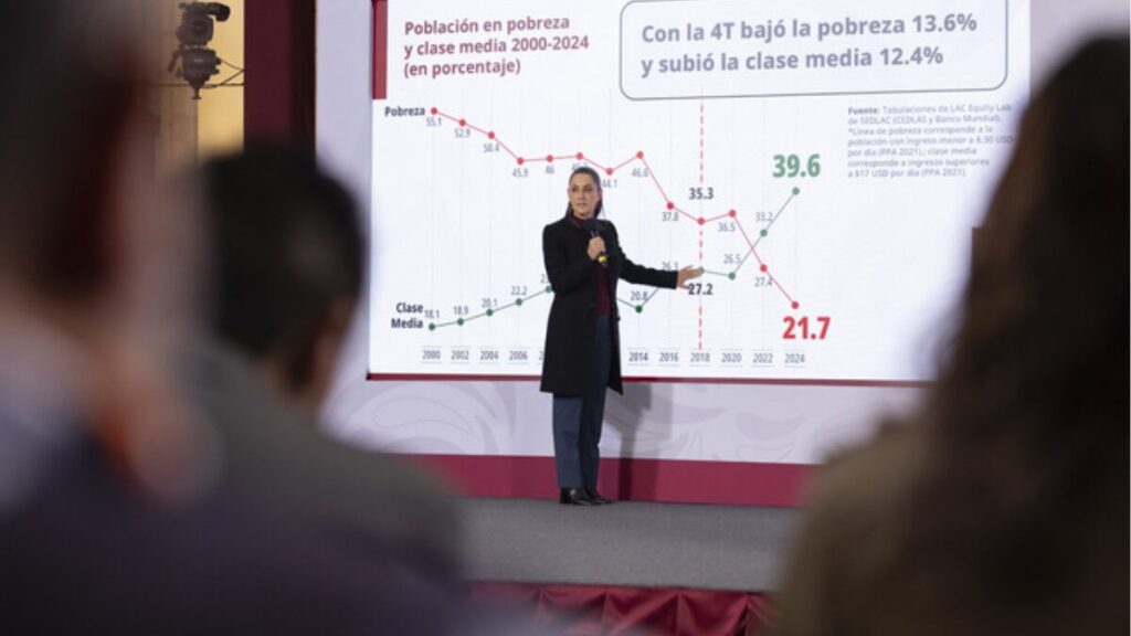 La Presidenta Claudia Sheinbaum Pardo resaltó que México, con la Cuarta Transformación, es el país de América Latina donde creció más la clase media, ya que incrementó 12.4 por ciento, de acuerdo con datos del Banco Mundial, al pasar de 27.2 por ciento en 2018 a 39.6 por ciento en 2024; el objetivo, señaló, es que siga la tendencia de aumento.