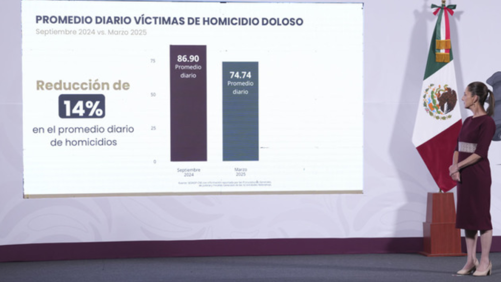 La Presidenta de México, Claudia Sheinbaum Pardo, resaltó que gracias a la Estrategia Nacional de Seguridad, en marzo de 2025 hay 12 homicidios diarios menos en el país que en septiembre de 2024.