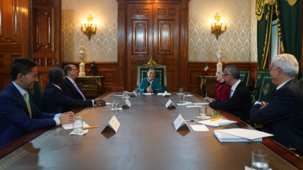 En Palacio Nacional, la presidenta Claudia Sheinbaum Pardo conversó este miércoles con Larry Fink, presidente de BlackRock, y Adebayo Ogunlesi, director ejecutivo de Global Infrastructure Partners, sobre la fortaleza de la economía mexicana y la importancia del tratado comercial entre México, Estados Unidos y Canadá (T-MEC).