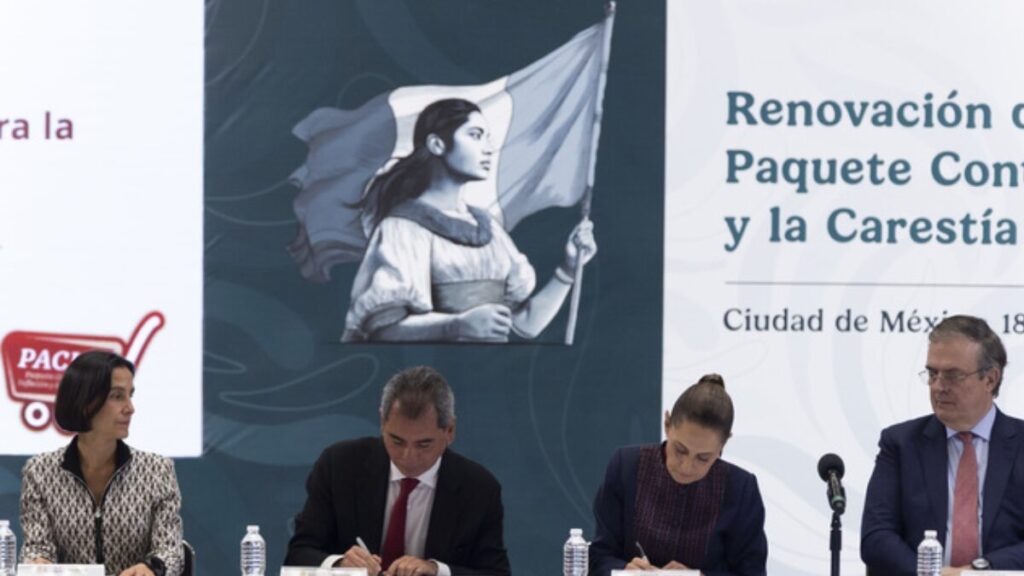 La Presidenta de México Claudia Sheinbaum Pardo firmó, con tiendas de autoservicio y agroindustrias, la renovación del Paquete Contra la Inflación y la Carestía (Pacic), que mantiene en 910 pesos el precio de los 24 productos de la canasta básica, es decir, no aumenta su precio y con ello se cuida la economía popular.