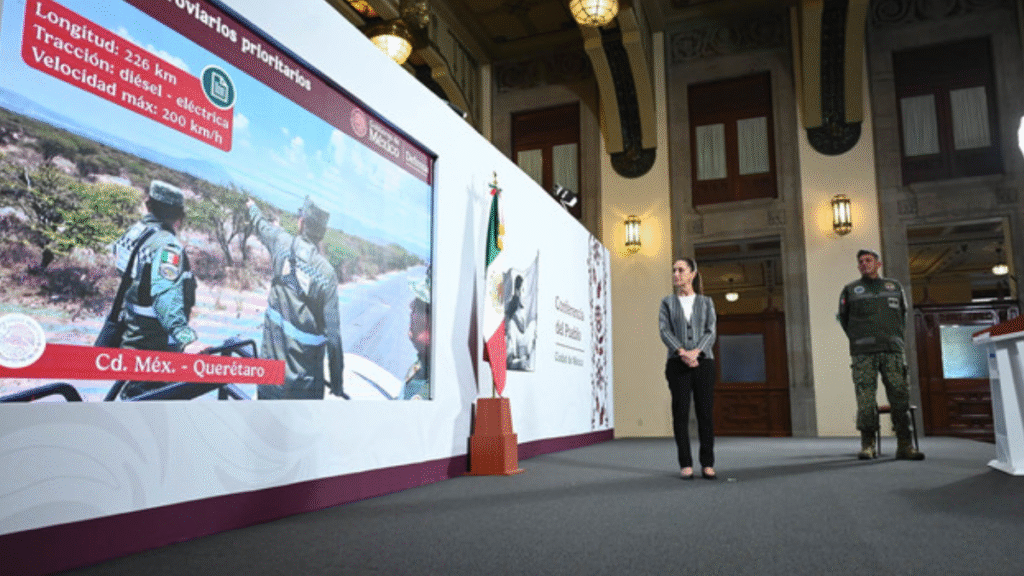 La Presidenta Claudia Sheinbaum Pardo destacó que a siete meses de su gobierno la inversión pública se ha traducido en obras como las nuevas rutas de trenes de pasajeros AIFA-Pachuca, Ciudad de México-Querétaro, así como la vía de carga del Tren Maya, cuya construcción están a cargo del agrupamiento de ingenieros militares “Felipe Ángeles» de la Secretaría de la Defensa Nacional. Mientras que los tramos Querétaro-Irapuato y Saltillo-Nuevo Laredo ya fueron licitados.