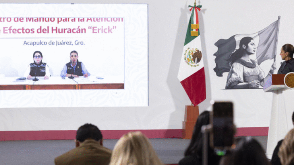A través de un enlace a “La mañanera del pueblo”, la coordinadora Nacional de Protección Civil, Laura Velázquez Alzúa, informó que, hasta el momento, continúan los efectos del huracán Erick con lluvias y vientos en 14 municipios de Oaxaca y en 6 de Guerrero; sin pérdidas humanas y hay 100 personas en refugios.