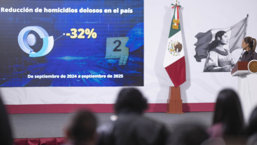 La Presidenta Claudia Sheinbaum Pardo resaltó que, a un año de gobierno, la reducción de 32 por ciento en los homicidios dolosos, entre septiembre de 2024 y septiembre de 2025, es muy significativa ya que representa 27 personas que no fallecen diariamente por este delito, lo cual lo atribuyó a la implementación de los cuatro ejes de la Estrategia Nacional de Seguridad.