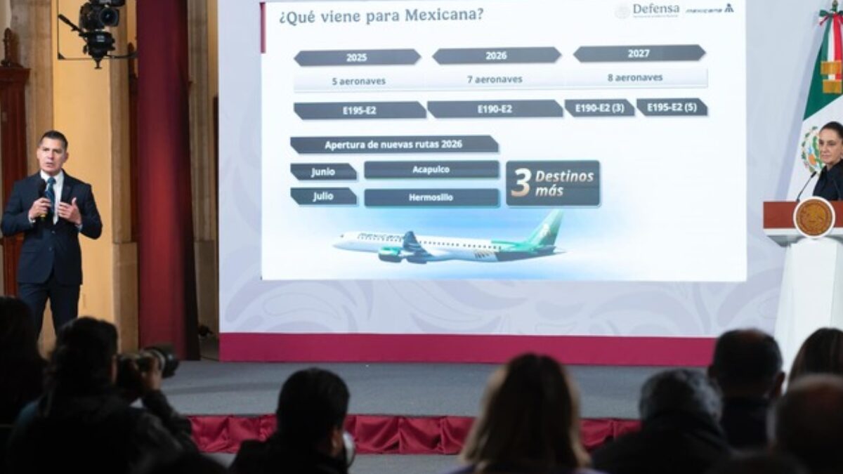 Anunció que en mayo, la aerolínea del Estado mexicano recibirá la primera aeronave Embraer de las siete programadas para este año, con lo que concluirá el 2026 con una flota de 12 aviones. Para 2027 llegarán ocho más, sumando 20 en total. Agregó que en junio de este año se abrirá la ruta hacia Acapulco, Guerrero y en julio a Hermosillo, Sonora; además se estima abrir tres destinos más.
