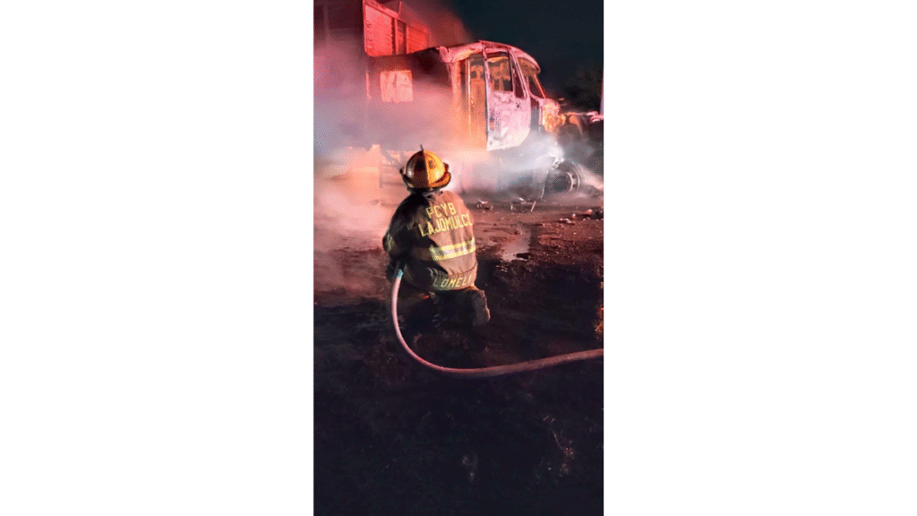 Oficiales de Protección Civil y Bomberos de Tlajomulco sofocaron el incendio en un camión tipo torton, esto luego de que se recibiera reporte a través del C4 Tlajomulco, en el que se informó del incidente sobre Circuito Metropolitano Sur a la altura de Santa Cruz de La Loma.