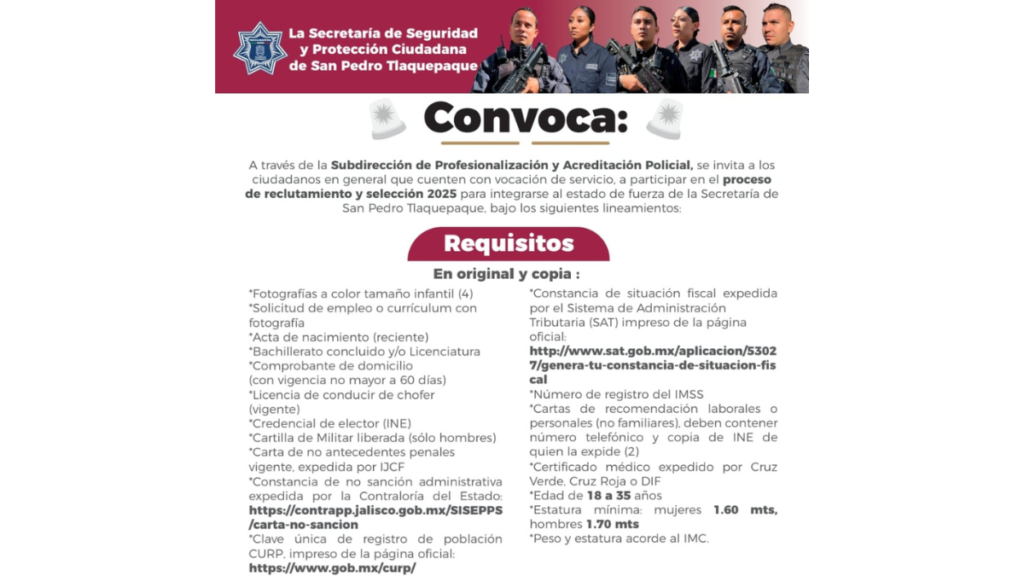 La Secretaría a de Seguridad y Protección Ciudadana de San Pedro Tlaquepaque, a través de la Subdirección de Profesionalización y Acreditación Policial, extiende una cordial invitación a las y los ciudadanos en general que cuenten con vocación de servicio, a participar en el proceso de reclutamiento y selección 2025 para integrarse al estado de fuerza de la Secretaría de Seguridad y Protección Ciudadana de San Pedro Tlaquepaque.