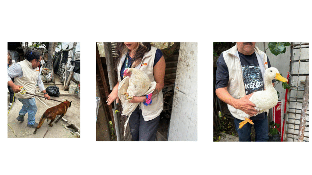 En total, se resguardaron siete perros de diferentes razas y edades —en estado de desnutrición, algunos con alopecia y pulgas— dos gallos de raza kelso y un pato criollo.
